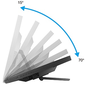 Vybavený stojan poskytuje flexibilní polohování, které umožňuje monitoru spočívat na stole jako laptop a sklopit se zpět do požadovaného úhlu. Díky tomu je snadné umístit monitor do ideální polohy pro pohodlné použití v jakémkoli prostředí.