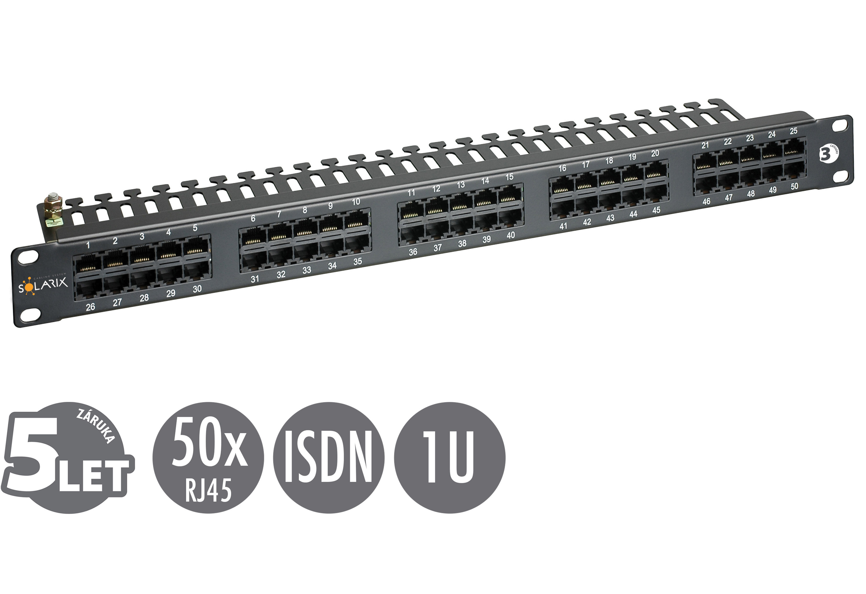 Solarix ISDN patch panel SX50-ISDN-BK je kvalitní telefonní panel určený pro tu část strukturované kabeláže, která slouží pro připojení uživatelských pracovišť k telefonní ústředně. Panel je osazen 50 porty typu RJ45 a zakončovacími moduly s duální svorkovnicí 110/Krone. Součástí panelu je vyvazovací lišta, která umožňuje přehledné uspořádání a pevné uchycení telefonního kabelu přímo k tělu patch panelu. Přednostmi ISDN panelů Solarix je jejich vysoká spolehlivost, životnost a především jednoduchá instalace. Panely splňují všechny požadavky definované pro kategorii 3. Barva ISDN patch panelů Solarix je černá. Velikost v datovém rozvaděči je 1U.