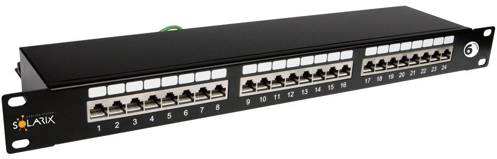 Patch panel Solarix s označením SX24-6-STP-BK je stíněný panel kategorie 6, který je osazen 24 porty RJ45 a duální IDC svorkovnicí 110/Krone. Kontakty jsou na svorkovnici odlišeny barvami podle typu zapojení, a to buď podle standardu T568A, nebo T568B. Tento panel z produktové řady Solarix – kategorie 6 bez problémů splňuje a rovněž převyšuje požadavky definované v mezinárodních standardech ANSI/TIA 568, ISO/IEC 11801 a EN 50173 pro kategorii 6 a třídu vedení Class E, včetně všech nejnovějších dodatků. Panel je navrhnut tak, aby byl robustní, spolehlivý, poskytoval maximální výkon a umožňoval jednoduchou instalaci. Součástí těla panelu je vyvazovací lišta, která umožňuje pevné uchycení a přehledné uspořádání datového kabelu. Barva stíněného patch panelu Solarix kategorie 6 je černá; velikost v datovém rozvaděči je 1U.