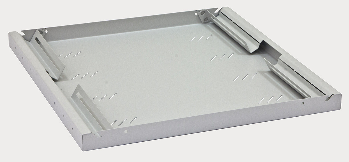 19" police s perforací 1U, integrované podpěry.