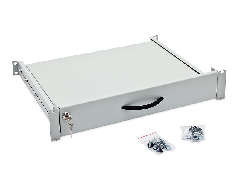 Výsuvná uzamykatelná 19´´ police 2U pro klávesnici a myš, uzamykatelná, hloubka zasunuté police je 371,5 mm