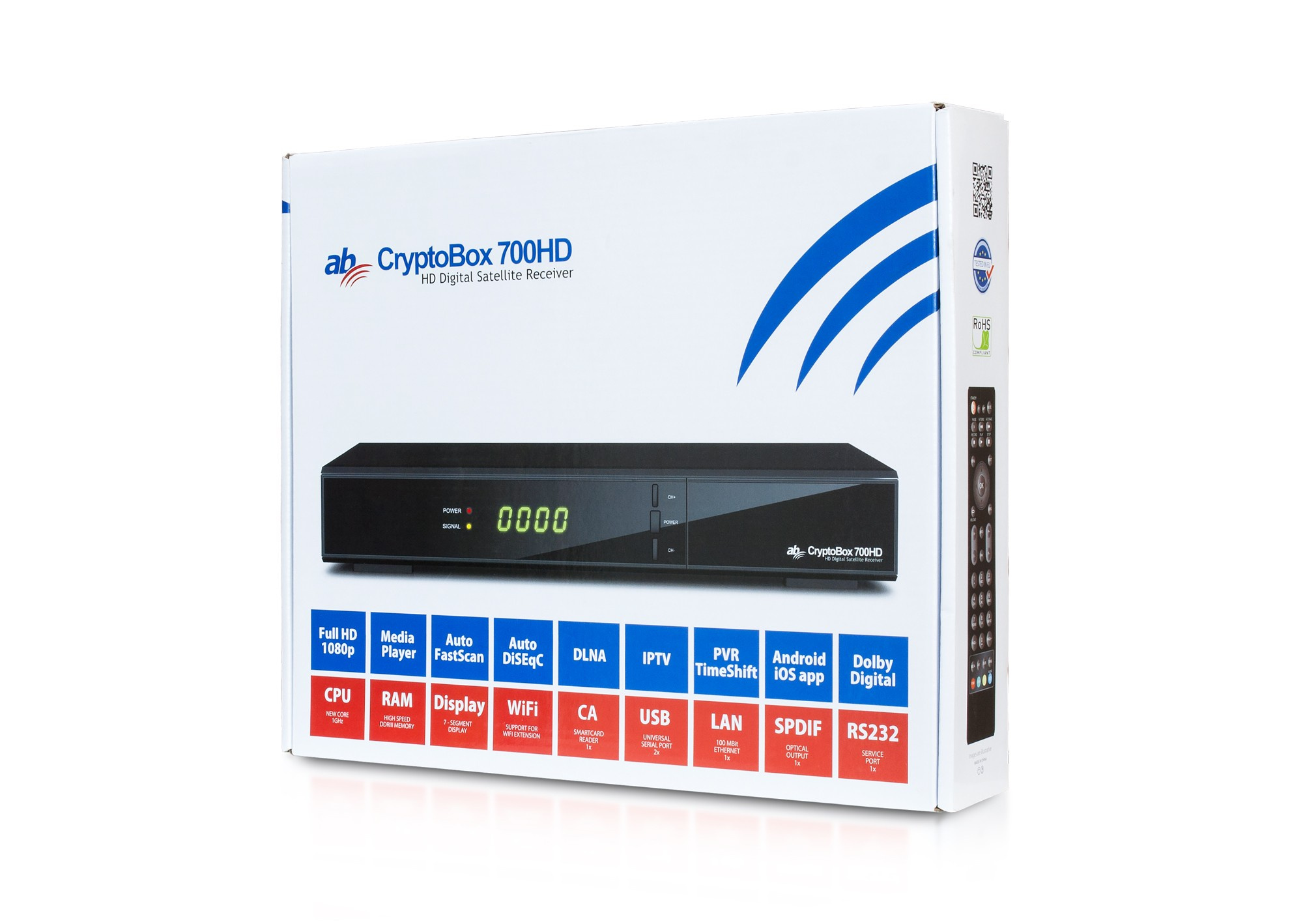 Nástupce nejúspěšnější řady satelitních přijímačů AB CryptoBox 6XX. Kombinace digitálního satelitního přijímače a multimediálního přehrávače v plném Full HD 1080p rozlišení. Možnost sledování HD programů, IPTV funkce, koukání živého vysílání na iOS a Android zařízeních, přehrávání multimediálního videa, obrázků a hudby.
