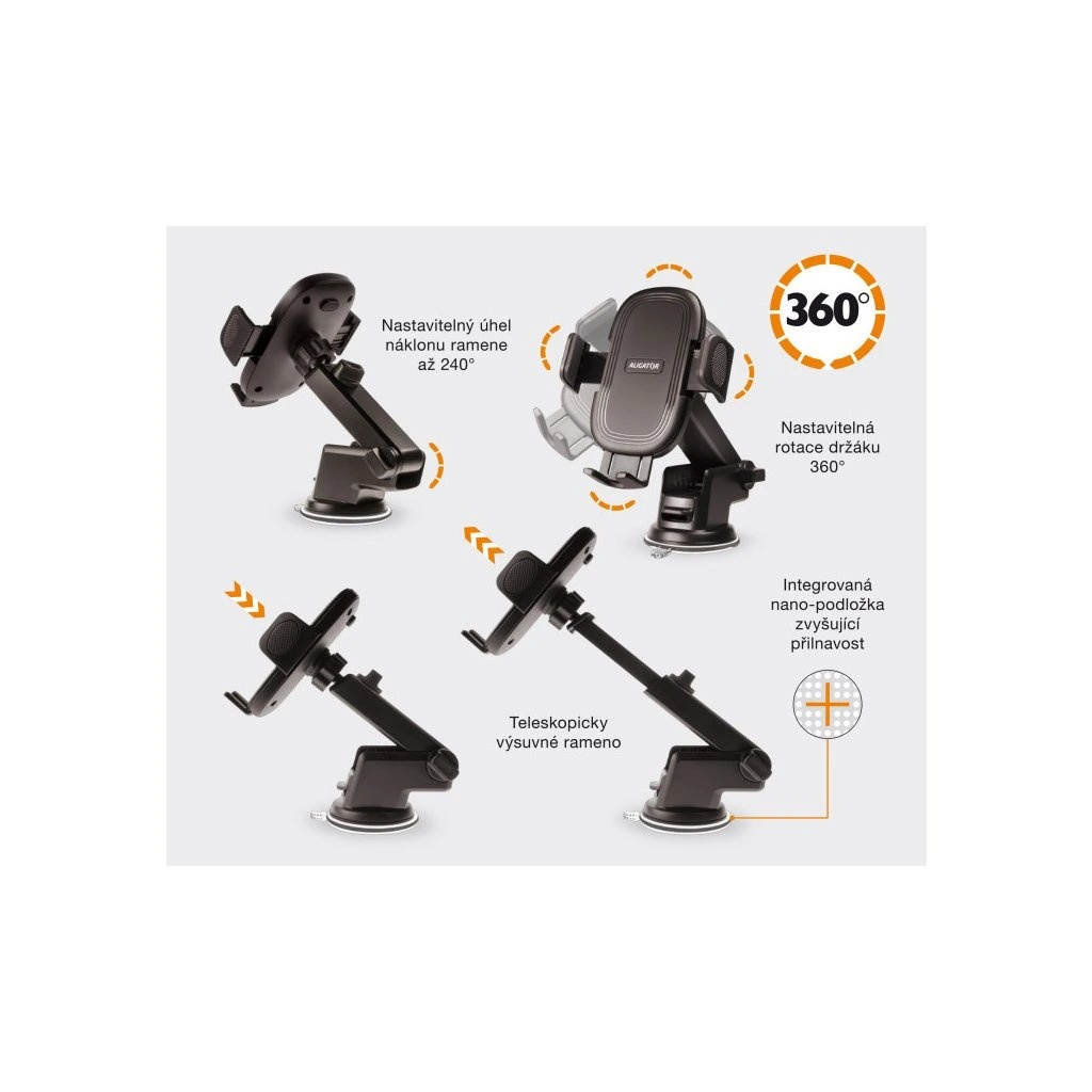 Univerzální držák pro mobilní telefony do auta s možností nastavení fixace. Pomocí vestavěné nano-podložky lze držák umístit na palubní desku i na čelní sklo. Díky speciálnímu mechanismu se přítlačné čelisti držáku roztahují pomocí tlačítka umístěného na zadní straně držáku. Naopak upevnění mobilního telefonu v držáku si manuálně uživatel nastaví přítiskem čelistí směrem k sobě, tak aby byl mobilní telefon pevně zafixován. Vycentrování mobilního telefonu v držáku zajistí manuálně výsuvná spodní čelist. Součástí spodní čelisti je průchodka pro možnost připojení nabíjecího kabelu. Praktické teleskopicky výsuvné rameno zajistí pohodlné nastavení vzdálenosti držáku od řidiče, navíc držák disponuje možností natočení mobilního telefonu v plném rozsahu 360°.