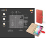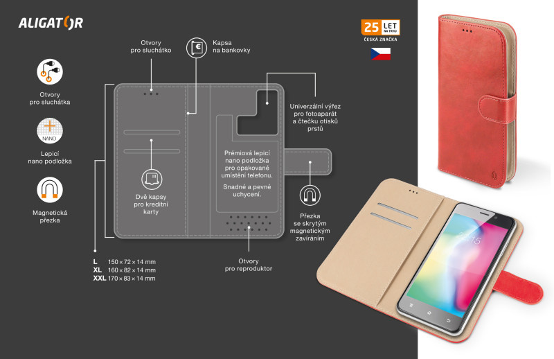 Dokonale propracovaný design, tenké provedení, přihrádka na kartu nebo vizitky, podélná kapsa na bankovky, zavírání pomocí magnetické přezky, snadné uchycení mobilního telefonu pomocí prémiové lepicí nano podložky, která je určena pro opakované umístění telefonu.