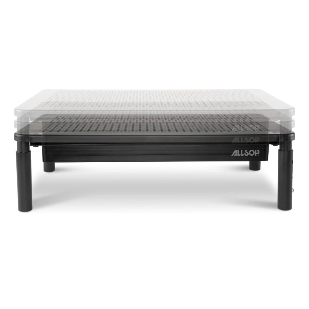 Trojúrovňový stojan na monitor Allsop Metal Art má odolnou kovovou platformu s práškovým nástřikem s perforovanými otvory s mikrotečkami a podporuje monitory až do hmotnosti 35 lb a 27 palců. Teleskopické nohy umožňují uživatelům vybrat si ze tří úrovní výšky (4,13 palce, 5,0 palce nebo 5,75 palce) pro ideální ergonomický komfort. Integrovaná úložná zásuvka je ideálním místem pro další zásoby a má slot pro telefon pro snadný přístup.