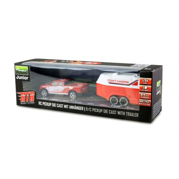 Pickup s přívěsem na dálkové ovládáníPředstavujeme vám dokonalou miniaturu - Pickup s přívěsem pro koně v měřítku 1:64, který si podmaní srdce každého malého i velkého nadšence dálkově řízených modelů. Celokovová karoserie z tlakového odlitku zajišťuje nejen realistický vzhled, ale také mimořádnou odolnost. Připravte se na zážitek, který vypadá jako opravdový, díky autentickému vzhledu doplněnému o cool samolepky, které dodávají jedinečný styl. Díky miniaturním rozměrům je tento pickup s přívěsem ideální pro všechny rovné povrchy, ať už uvnitř či venku. Plastový přívěs lze snadno odejmout, což přidává další úroveň flexibility a zábavy.RC Pickup s nastavitelnou rychlostíTento pickup nabízí tři různé rychlosti: 20%, 50% a plnou 100% rychlost. To znamená, že si zábavu užijete v každé fázi vaší řidičské zručnosti. S integrovanou 3,7V 150mAh Li-Ion baterií si můžete užít až 60 minut jízdy na jedno nabití, což je více než dostatek času pro vaše dobrodružství. S přiloženým USB nabíjecím kabelem je dobíjení jednoduché a rychlé, takže se nikdy nemusíte obávat, že byste zůstali bez energie. LED osvětlení vpředu a vzadu přináší skvělé světelné efekty i ve tmě, což dělá z každé jízdy speciální zážitek. Bez ohledu na podmínky budete mít vždy jasno ve směru, kam míříte.Kompletní RTR baleníNemusíte se starat o shánění dalších součástí, protože naše RTR sada obsahuje vše potřebné. Od dálkového ovládání, přes dobíjecí akumulátor, až po potřebné baterie a nabíjecí kabel. Jednoduše rozbalte a vyrazte na cestu.Model je k dispozici i v modré variantě.Technické specifikace:Délka přívěsu: 70 mm (bez oje)Celková délka: 165 mmRozvor: 50 mmRozchod kol vpředu a vzadu: 25 mmSvětlá výška: 3 mmBrzdy: elektronickéNabíječka: USB-A na USB-CDoba nabíjení: cca 30-40 min. Obsah balení: RC Pickup s přívěsem pro koně 1:64 Ovladač 2,4 GHz Akumulátor Li-Ion 1S 3,7 V 150 mAh Nabíjecí kabel USB Návod Technické parametry: Měřítko: 1/64 Délka auta: 8 Šířka auta: 2.8 Výška auta: 2.5 Hmotnost auta: 84 Auto je vhodné na ven: ano Barva: červená Auto je vhodné do interiéru: ano Rychlost auta: 10 Kapacita akumulátoru v autě: 150 Napětí akumulátoru v autě: 3.7 Typ akumulátoru do auta: Li-ion Typ nabíječky: USB Doba jízdy auta: 60 Dosah ovládání auta: 20 Frekvence ovládání RC auta: 2,4Ghz Konstrukce ovladače k autu: Tlačítkový Vodotěsnost (potopení): ne