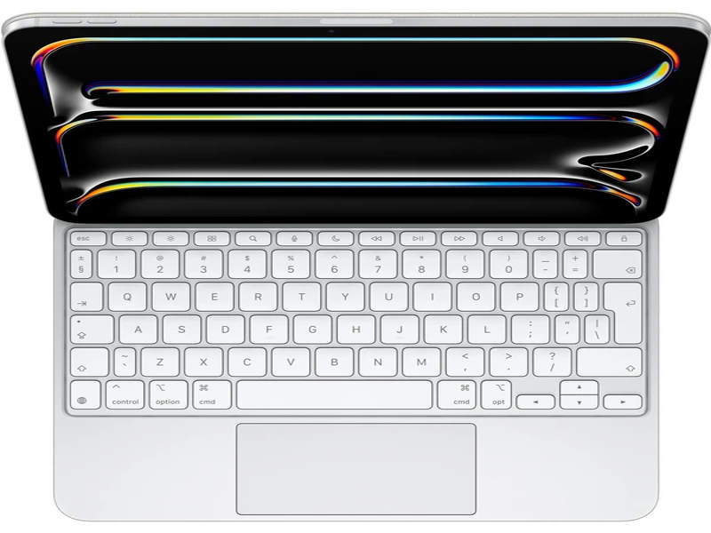 Nová Magic Keyboard pro iPad Pro 2024 se pyšní plovoucím designem, který umožňuje plynulé nastavení úhlu sklonu displeje. Díky tomu si můžete iPad Pro upravit do ideální polohy pro práci i zábavu, ať už sedíte u stolu, na gauči nebo v letadle. Klávesnice je vyrobena z kvalitních materiálů a je neuvěřitelně tenká a lehká, takže ji můžete snadno přenášet kamkoli jdete.