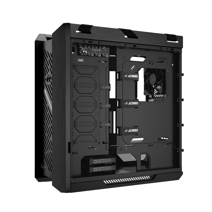 Skříň ROG Strix Helios II je určena pro reprezentativní sestavy. Je vybavena dvěma bočními panely z tvrzeného skla o tloušťce 4 mm, které jsou zasazeny do elegantního rámu z broušeného hliníku. Hliníkový přední panel s diamantovým designem mřížky je vyroben pomocí vysoce přesné CNC frézovací technologie a procesu eloxování. Šikmé zářezy na přední straně jsou inspirovány elegancí a osobitostí závodních vozů, díky nimž je Helios II jedinečný. Díky zaobleným hranám, aerodynamickému tvaru a skrytým spojům je tato skříň elegantnější než kdy dřív.