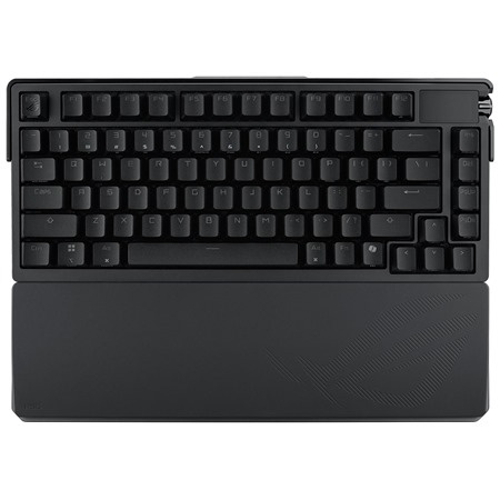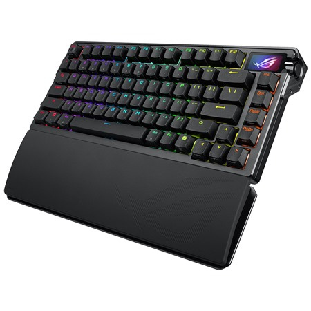 Herní klávesnice ROG Azoth Extreme 75 % z hliníkové slitiny, polohovací deskou z uhlíkových vláken, nastavitelným těsněním, plnobarevným dotykovým OLED displejem s třísměrným ovládacím knoflíkem, rozšířenou opěrkou zápěstí, magnetickými nožičkami, třemi režimy připojení s technologií 2,4 GHz SpeedNova, předmazanými mechanickými spínači ROG NX s možností výměny za provozu a podporou počítačů Mac