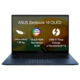 Výkonný a kompaktní Zenbook 14 OLED je tenký pouhých 16,9 mm a váží jen 1,39 kg. Uchvátí vás novým designem, který je nadčasově elegantní a zároveň zcela moderní. Dokonalý obraz vám nabídne velká dotyková obrazovka OLED HDR NanoEdge s poměrem stran 16:10 a rozlišením 2,8K. Displej má přesné barvy díky validaci PANTONE®, jas až 550 nitů, a pokrývá 100 % barevného spektra DCI-P3 na úrovni kino kvality. Procesor Intel® Core™ i5-1240P 1,7 GHz (12M mezipaměť, až 4,4 GHz, 4P+8E jádra), grafika Intel Iris® Xe, 8 GB RAM a 512 GB SSD poskytují vynikající výkon. Dlouhou výdrž zajišťuje baterie s kapacitou 75 Wh. O mimořádný zvuk se stará audio systém Dolby Atmos s inteligentním zesilovačem. Design zaměřený na uživatele zahrnuje přihlášení jedním dotykem pomocí snímače otisků prstů na zapínacím tlačítku, novou klávesnici ASUS ErgoSense a efektivní funkci ASUS NumberPad 2.0. Nový odvážný design víka je inspirován tradiční uměleckou technikou Kincugi a nabízí se ve dvou nových svěžích barevných variantách: Ponder Blue a Aqua Celadon. Zenbook 14 OLED je nový etalon dokonalé mobility.