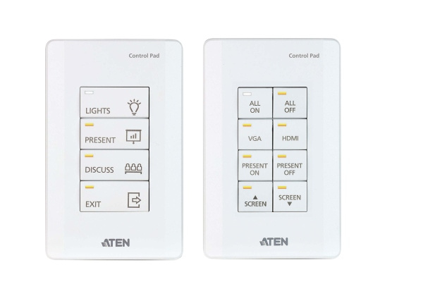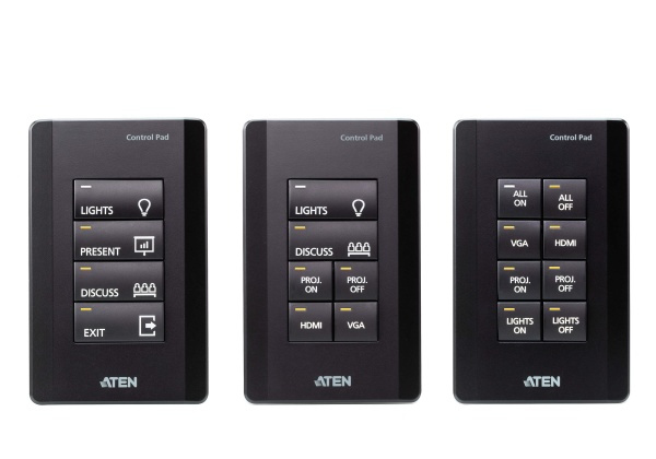 Řídicí systém ATEN je systém správy založený na Ethernetu, který propojuje všechna hardwarová zařízení nacházející se v místnosti pro centralizované řízení bez námahy. Ovládací panel VK0100 hraje nejen roli hlavního ovladače, který propojuje hardwarová zařízení, ale funguje také jako ovládací rozhraní s přizpůsobitelnými tlačítky a rozložením. Podložka Control Pad s jedním tlačítkem byla vytvořena s ohledem na flexibilitu a lze ji rozvrhnout do 14 různých kombinací 4 až 8 tlačítek, které se do sebe zaklapnou stejně snadno jako stavebnice Lego. Po připojení k místní síti uživatelé zjistí, že pomocí softwaru VK6000 lze bez námahy konfigurovat požadované ovládání jakéhokoli připojeného zařízení z podložky Control Pad. S kombinovanou podložkou Control Pad připravenou k použití získáte okamžité a inteligentní ovládání zařízení z podložky Control Pad, která dokáže spravovat jakékoli zařízení v místnosti.