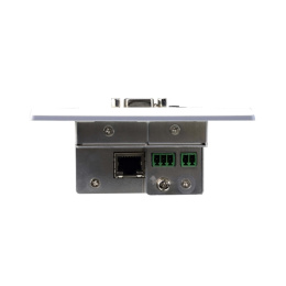 For mounting in standard 2-gang junction boxes, the VE2812AUST is a wall plate transmitter for sending VGA (with audio) and HDMI, as well as IR/RS-232 signals, up to 100 m over a single Cat 5e/6/6a cable that is designed to merge with the clean and elegant decor of modern meeting rooms, boardrooms, conference rooms, classrooms, and lecture halls.