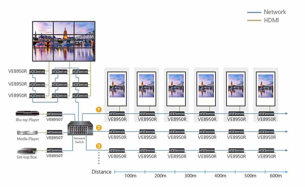 Tento VE8950R Video over IP přijímač je navržen tak, aby splňoval dnešní požadavky velkoplošného, vícekanálového přenosu signálu 4K a byl navržen pro snadné nastavení a ovládání. Je ideálním produktem pro širokou škálu prostředí, jako jsou např. letiště, univerzitní kampusy, konferenční centra a nákupní centra