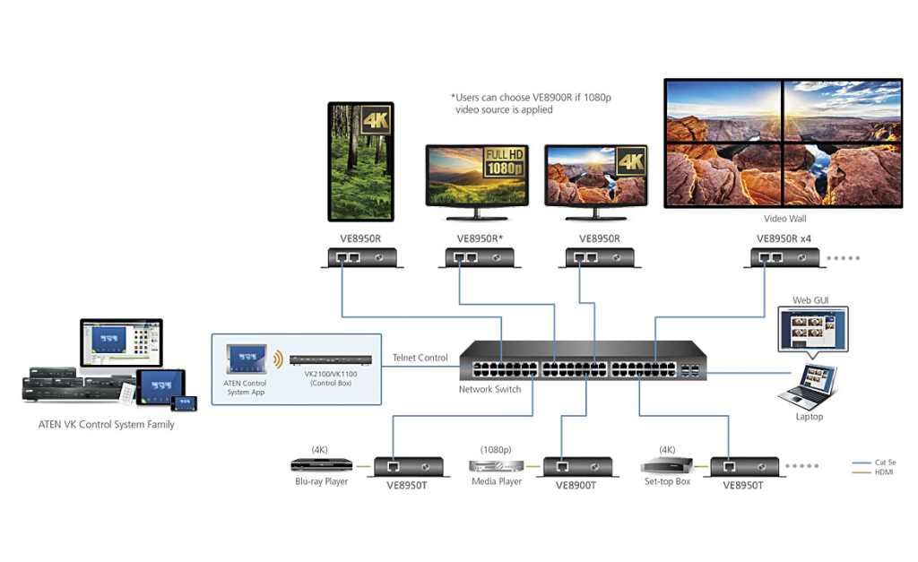 ATEN VE8950R Video přes IP přijímač poskytuje vizuálně bezztrátové 4K AV signály s nízkou latencí na dlouhé vzdálenosti prostřednictvím lokální sítě standardního síťového přepínače Gigabit *.