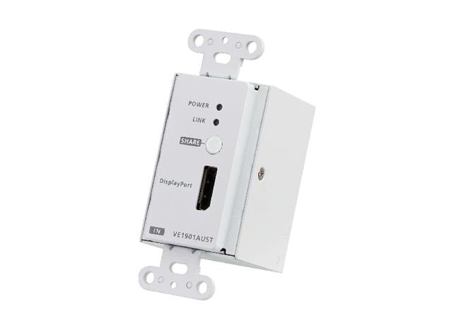 VE1901AUST lze snadno namontovat do spojovacího boxu 1 gangu s americkou stěnovou deskou, která skrývá objemné kabelové sestavy a prezentuje potřebné informace v dohledu. Kromě toho, s vestavěnou funkcí PoH (Power over HDBaseT), VE1901AUST přijímá napájení z připojeného přijímače poH PSE (Power Source Equipment) a zjednodušuje složité nasazení elektrického vedení. S funkcí sdílení může VE1901AUST vzdáleně přepínat zdroj při připojení ke kompatibilnímu přijímači, například VP1421, což uživatelům přináší pohodlnější AV rozšíření.