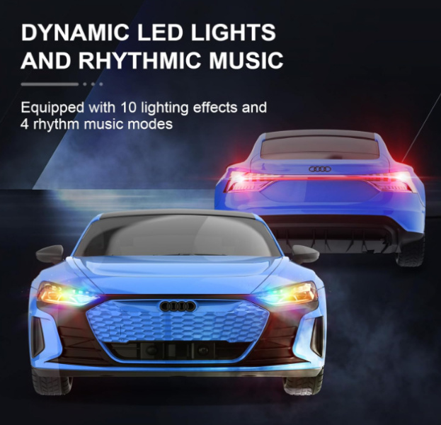 Elektromobil Audi RS na dálkové ovládáníVěrná replika nejmodernějšího elektromobilu na světe Audi RS e-tron GT, v nádherné metalicky modré metalíze, je vyrobená z odolných plastů s hladkými liniemi. Licencované RC auto na dálkové ovládání má nejen autentický vzhled, ale i skvělé jízdní vlastnosti a světelné i zvukové doprovodné funkce, které zajistí, že se od něj děti nedokážou odtrhnout. RC auto pro nejmenší Audi RS kombinuje luxus a zábavu v jednom! Krásná designová kola s gumovými pneumatikami zajišťují skvělou trakci na hladkém povrchu. Elektromobil jezdí plynule, velmi přirozeně rychlostí cca 2 km/h. Ovládání je páčkové, menší, velmi dobře se drží v rukou. Ovládání není nijak složité, bez problémů si s ním poradí i ti nejmenší. Je to skvělý dárek pro děti.RC auto pro dětiE-tron Audi RS je nejen jednoduchý na ovládání, ale také je vybaven LED osvětlením a zvukovým modulem. O takovém autě sní každý malý kluk, ale díky krásnému, modernímu designu nezklame žádnou milovnici aut, proto ho řadíme i do kategorie RC modelů pro holky.RC auto je vybaveno předním i zadním LED osvětlením, přední světla v základním režimu svítí bíle a zadní červeně. Funkční jsou blinkry jak vepředu, tak vzadu spolu s varovnými světly při zpátečce. Blinkry jsou doprovázeny jemným klapavým zvukem a zpátečka typickým varovným signálem. Na dálkovém ovladači je možné zapnout i hudbu, na výběr jsou 4 známé melodie, které vám auto zahraje. Světla doprovází hudbu až 10-ti různými schématy. LED osvětlení není nijak zvlášť intenzivní, ale efektně dokresluje celý RC model. Dětmi velice oblíbený klakson nesmí chybět. Velmi originální je speciální tlačítko na ovladači pro parkovaní. RC auto dokáže samo zacouvat a zaparkovat.Pro rodiče máme dobrou zprávu, všechny zvukové efekty lze vypnout a z RC auta se stane opravdu tichý elektromobil.Originální nabíjeníRC auto je vybaveno integrovaným akumulátorem 3,7 V 1200 mAh, díky kterému si užijete spoustu zábavy po cca 30 minut. Velmi originální je nabíječka, která vypadá jako stojan pro nabíjení elektromobilů. Pomocí kabelu ji zapojíte do USB adaptéru a pomocí druhého do RC auta. Stačí jen otevřít ,,víčko nádrže,, a můžete nabíjet. Navíc je nabíjecí stojan vybaven světelnou signalizací, takže přesně vidíte vývoj nabíjení, které trvá cca 30 minut.Dálkové ovládání funguje na frekvenci 2,4 GHz, takže se vám nebude rušit s dalšími RC modely. Do ovladače potřebujete 2 x AA baterie. Obsah balení: RC auto Audi RS e-tron GT Dálkové ovládání USB nabíječka Integrovaný akumulátor Technické parametry: Konstrukce auta: Silniční Délka auta: 31 Šířka auta: 13.5 Výška auta: 8.8 Auto je vhodné na ven: ano Barva: modrá Auto je vhodné do interiéru: ano Typ motorů v autě: stejnosměrné Rychlost auta: 2 Kapacita akumulátoru v autě: 1200 Napětí akumulátoru v autě: 3.7 Typ nabíječky: USB Výměnný akumulátor v autě: ne Napájení ovladače k autu: 2xAA Doba jízdy auta: 30 Frekvence ovládání RC auta: 2,4Ghz Konstrukce ovladače k autu: Páčkový Plynulá regulace rychlosti: ne Plynulá řízení zatáčení: ne Voděodolnost (stříkající voda): ne Vodotěsnost (potopení): ne