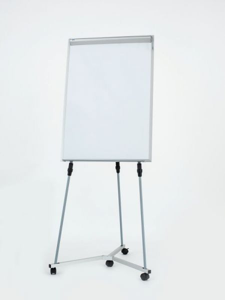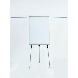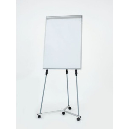 Flipchart s magnetickým povrchem. Výklopná ramena. Uchycení papíru moderním hliníkovým CLIP systémem. Teleskopické nastavení opěrných nohou s mobilními kolečky.