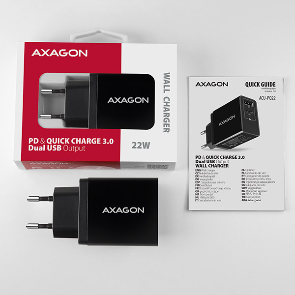 AXAGON ACU-PQ22, PD & QC nabíječka do sítě 22W, 2x port (USB-A + USB-C), PD3.0/QC3.0/AFC/FCP/Apple,