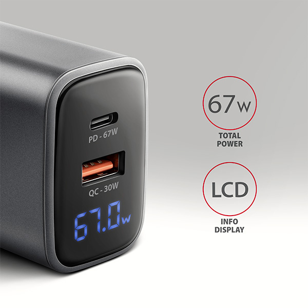 AXAGON ACU-PQ67D GaN nabíječka do sítě 67W, USB-A + USB-C, PD3.0/PPS/QC4+/SFC2.0/Apple, LCD display