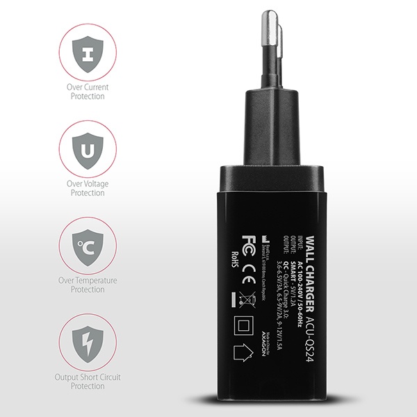 Dva nezávislé USB výstupy Quick Charge 3.0 a SMART 5V/1.2A umožní rychlé nabíjení většiny mobilních zařízení. Je kompatibilní se standardy rychlého nabíjení Apple iPhone, iPad, Samsung, Huawei, Honor, HTC, Xiaomi, LG, Motorola a dalších.