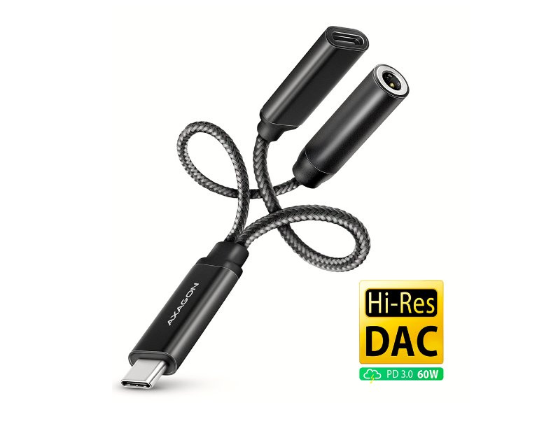 AXAGON ADA-HCPD Hi-Res DAC AUDIO ADAPTER je ideální doplňkem pro váš telefon, tablet, notebook nebo stolní počítač s USB-C konektorem, který vám poskytne chybějící 3.5 mm audio jack. Velkou výhodu představuje integrovaný konektor Power Delivery, který umožňuje současné připojení nabíječky a tím poskytuje možnost napájení připojeného telefonu. Adaptér obsahuje vysoce kvalitní DAC převodník, který při přehrávání nabízí vzorkování až 384 kHz / 32 bitů, což zajišťuje vynikající zvukovou kvalitu.