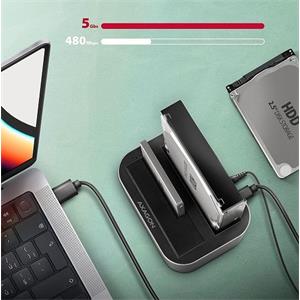 Duální USB-C 5Gbps dokovací stanice až pro dva 2.5"/3.5" SATA HDD/SSD.