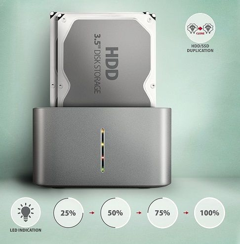Dokovací stanici také využijete pro snadné klonování obsahu připojených disků bez potřeby připojení k PC. Do prvního slotu stanice HDD A (source) zasunete zdrojový disk a do druhého slotu HDD B (target) zasunete cílový disk. Pak jen zmáčknete klonovací tlačítko a sledujete průběh klonování na stupnici čtyř LED diod. Po zkopírování všech dat je na cílovém disku přesná kopie původního disku. Dock tak lze využít jako autonomní zařízení pro pohodlné duplikování a vytváření obrazů disků. Jedná se o nejjednodušší způsob, jak přenést obsah například starého HDD disku na nový SSD disk, a to včetně funkčního operačního systému (Windows, macOS, Linux …).