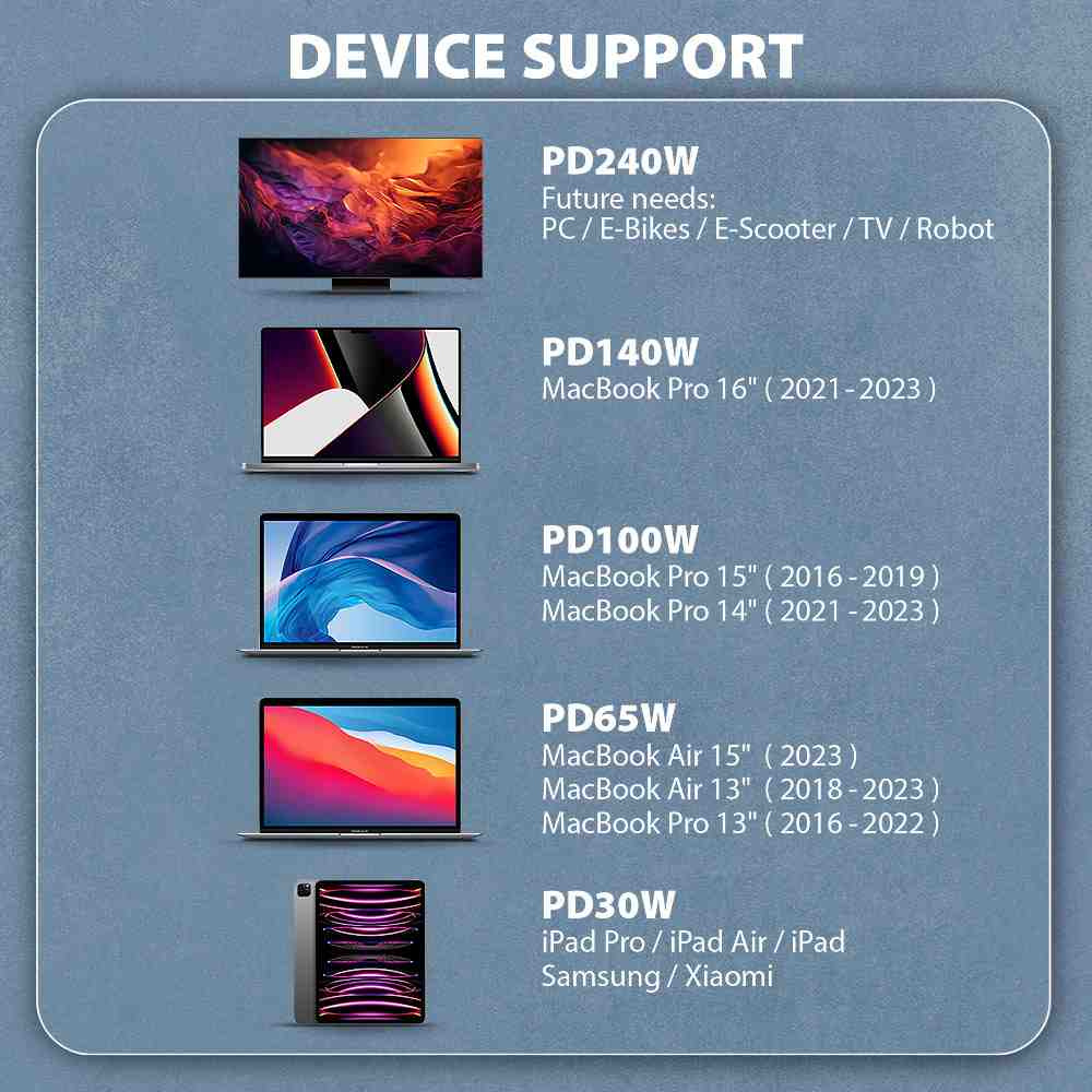 Kabel má implementovánu nejnovější specifikaci nabíjecí technologie Power Delivery 3.1. Tato technologie přináší mimo jiné výkon 240W což je více než dvojnásobek oproti Power delivery 3.0, která dosahuje výkonu 100W. Můžete tak využít nejen standardní rozsah výkonu (Standard Power Range - SPR) pro napětí 5, 9, 15 a 20V s proudem 5A, ale i dostatečný výkon v pevných napětí 28, 36 a 48V s maximálním proudem 5A (Extended Power Range - EPR). Kabel díky nové technologii PD 3.1 můžete využít i pro napájení zařízení s mnohem větším výkonem jako jsou herní notebooky, 8K monitory, dokovací stanice. Pro identifikaci kabelu a jeho proudových schopností má kabel integrován E-Mark čip.