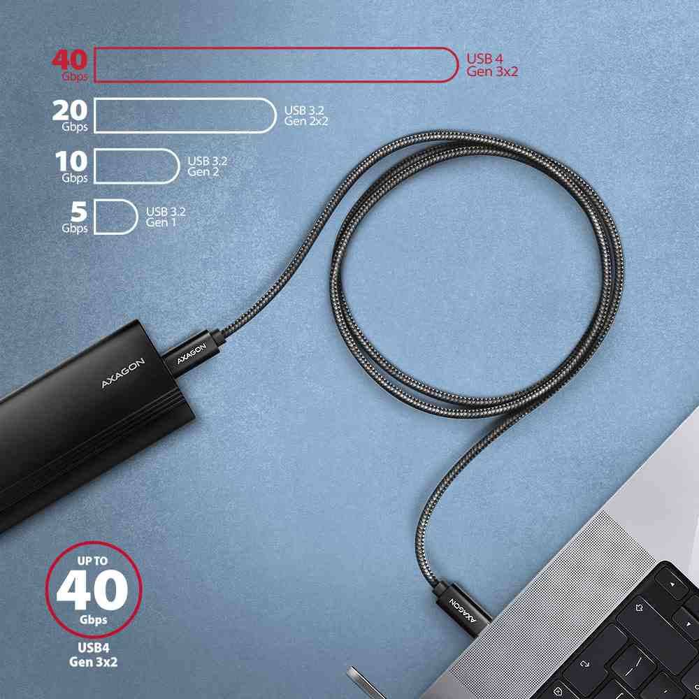 Prémiový propojovací USB-C --- USB-C datový a nabíjecí AXAGON BUCM4X-CM10AB NewGEN+ kabel s konektory USB-C male na obou koncích. Kabel má plnohodnotné (Full-featured) zapojení podle specifikace USB 40Gbps (USB4 Gen 3x2) a je plně kompatibilní se specifikací Thunderbolt 3 a Thunderbolt 4. Je navržen pro nejrychlejší datové přenosy, přenos videa a nabíjení notebooků, telefonů, tabletů. Umožňuje připojení monitorů, dokovacích stanic a externích SSD disků.