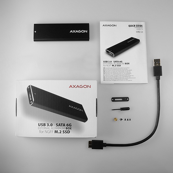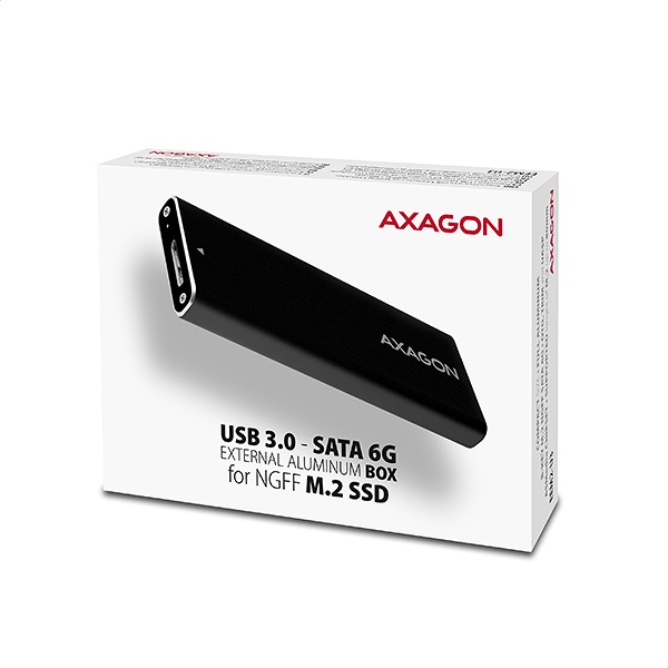 Hliníkový externí box AXAGON EEM2-U3 s USB 3.0 (USB 3.1 Gen.1) je určen pro SATA M.2 SSD disky.