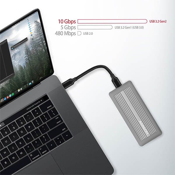 SuperSpeed USB 10 Gbit/s rozhraní dovolí užívat si rychlost moderních M.2 SSD disků. Díky rychlému USB 3.2 Gen 2 rozhraní je přenosová rychlost až 10Gb/s. Pohodlné připojení umožňuje oboustranný USB-C konektor. V balení naleznete rovnou dva kabely pro připojení boxu - klasický kabel USB-A / USB-C a také USB-C / USB-C kabel. Externí M.2 box podporuje i další moderní funkce např. TRIM.