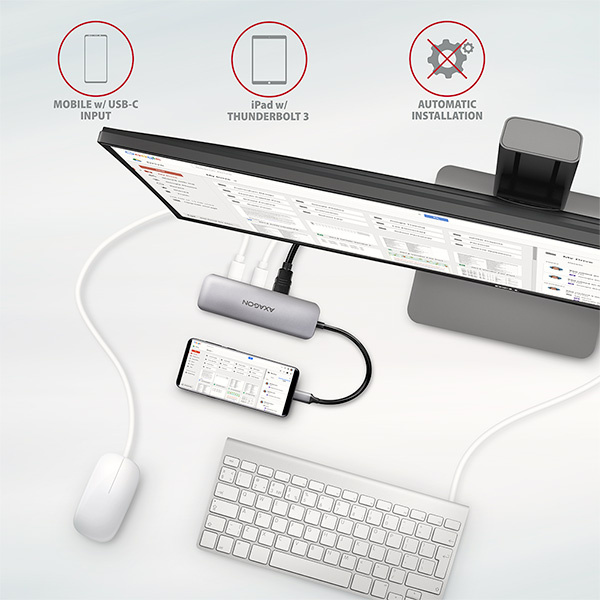 Replikátor portů je ideálním doplňkem pro notebooky bez USB-A konektorů, čtečky karet a video výstupu. V hubu lze využít Vaše stávající USB periferie bez nutnosti pořizování nových. Díky funkcím Plug and Play a Hot Plug je samotné zapojení hubu velmi jednoduché bez složité instalace a také lze jednoduše připojovat a odpojovat periferie za běhu počítače. Rozbočovač se nezalekne ani připojení k telefonům s USB-C konektorem. K telefonu tak připojíte například flash disk, klávesnici, myš, monitor, TV nebo projektor.