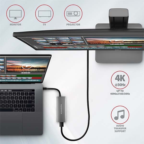 HDMI výstup poskytuje kvalitní obraz až do rozlišení 4K/60Hz Ultra HD a podporuje přenos vícekanálového zvuku. Podporovány jsou také vysoké frekvence v oblíbených hráčských rozlišeních 2K/120Hz nebo FullHD/120Hz. Díky podpoře HDR (vysoký dynamický rozsah) si můžete bez omezení vychutnat výrazně rozšířený rozsah barev a kontrastů. Pro správné fungování video výstupu je nutné, aby notebook měl USB-C port s podporou DisplayPort Alternate Mode (DP Alt Mode) nebo port Thunderbolt 3, 4 a výše.