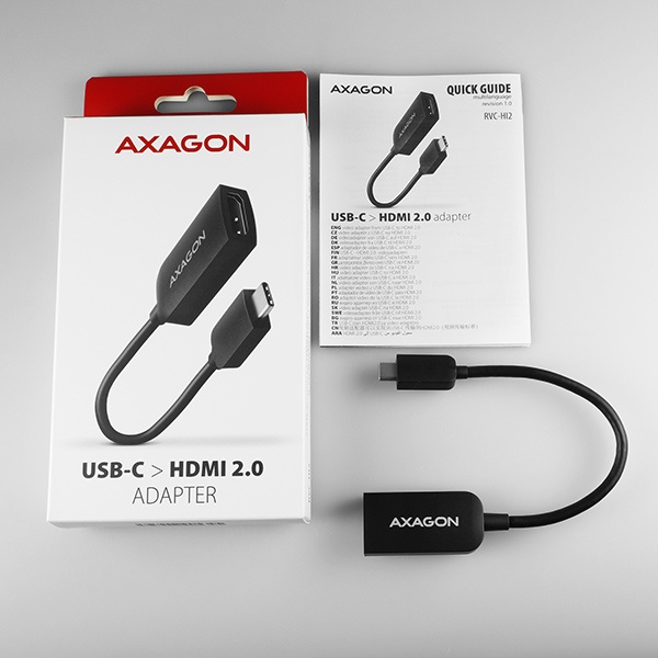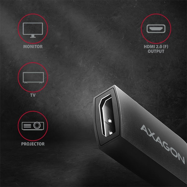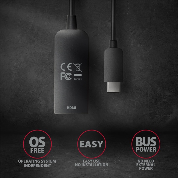 Moderní USB-C -> HDMI 2.0 aktivní adaptér AXAGON RVC-HI2 pro připojení HDMI monitoru/TV/projektoru k notebooku nebo telefonu pomocí USB-C konektoru.