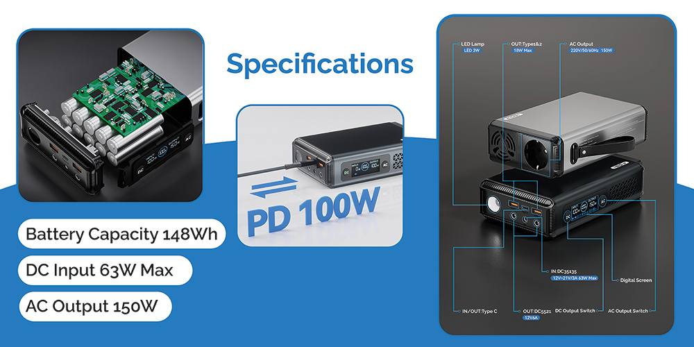 Kapacita baterie 148Wh • AC 230V výstup 150W max. • USB-C PD vstup/výstup 100W max. • 2 x USB-A výstup 18W max. • 2 x DC5521 výstup 72W max. • LED svítilna 3W • Funkce pass-through • váha 1.5 kg