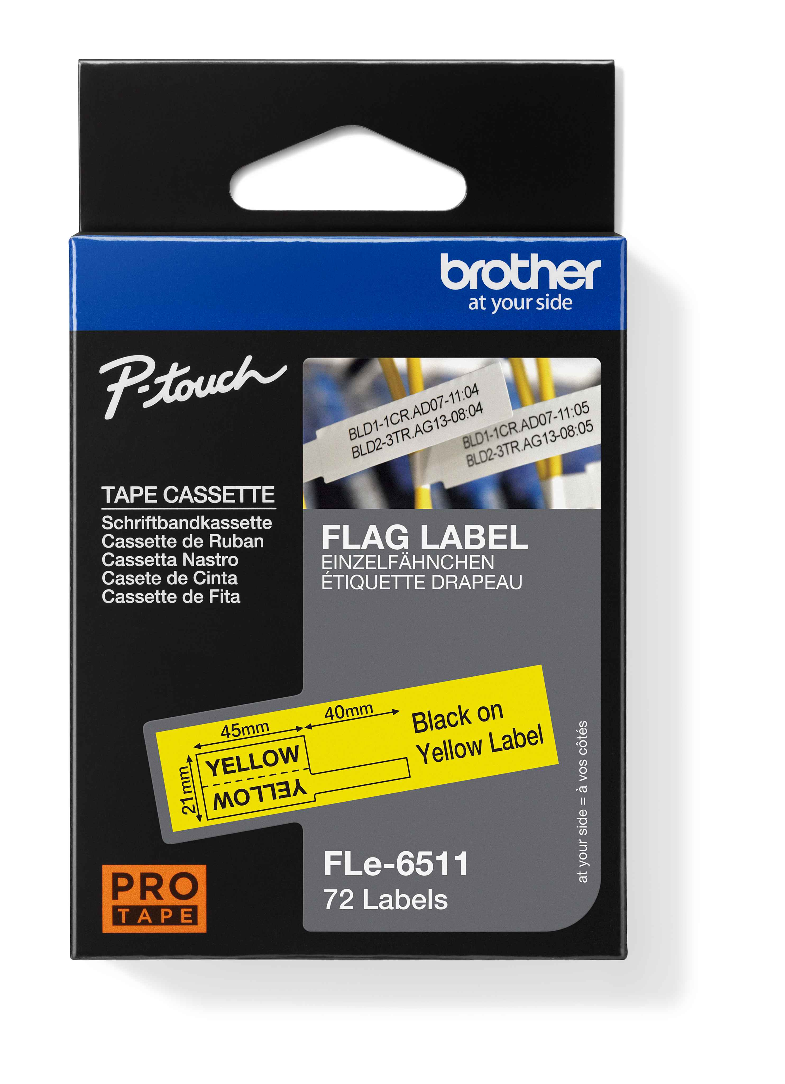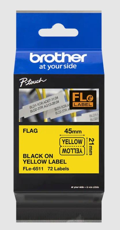 Tato popisovací černo-žlutá páska FLe-6511 je ideální jak pro identifikaci kabelů tak pro univerzální použití. Jednoduše vytiskněte text nebo čárový kód na dvě části předřezaného štítku. Připevněte proužek štítku kolem kabelu, poté vezměte vytištěný předřezaný štítek a jednu polovinu přilepte na proužek štítku a poté jej přeložte přes druhou polovinu.