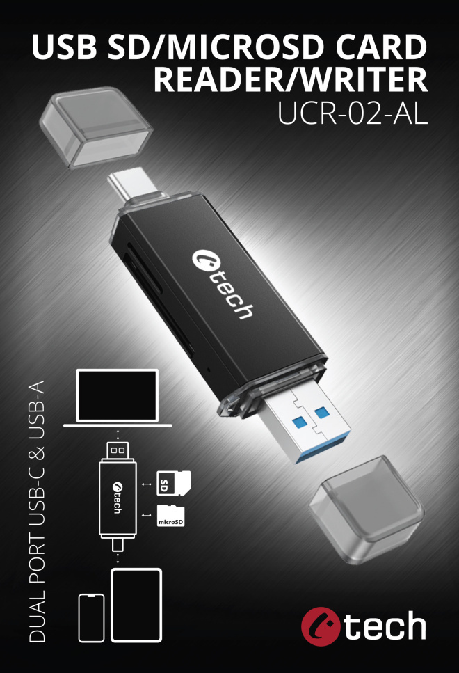 Univerzální kompaktní USB čtečka paměťových karet C-tech UCR-02-AL se díky dualnímu konektoru a široké podpoře podporovaných paměťových karet typu SD stané vítaným rozšířením vašeho počítače, notebooku či mobilního zařízení. Čtečka podporuje všechny současné verze SD a microSD karet včetně SDXC a microSDXC s kapacitou až 512GB. K zařízení ji snadno připojíte pomocí USB-A nebo USB-C konektoru a svému uživateli nabídne přenos dat rychlostí až 5Gbps. Kovové tělo čtečky nejen skvěle vypadá, ale zvyšuje také její odolnost. Oba konektory jsou při přenášení chráněny krytkami. Díky USB 3.0 rozhraní dosahuje čtečka výrazně vyšších přenosových rychlostí u karet oproti čtečkám s USB 2.0 rozhraním. Čtečka potěší možností současné práce s kartami v obou slotech a přímého kopírování mezi nimi. Nechybí široká podpora operačních systémů a podpora Plug and Play standartu díky kterému stačí pouze připojit k zařízení a počkat na automatickou instalaci ovladačů a následně začít čtečku plně využívat. Za pomocí funkce OTG ji snadno propojíte s vaším mobilním telefonem.