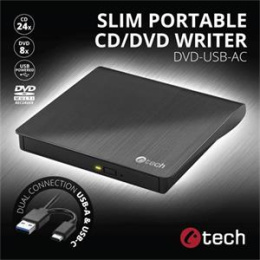 C-tech DVD-USB-AC je elegantní externí DVD vypalovačka, která se vyznačuje kompaktním a snadno přenosným slim provedením s integrovaným USB kabelem. Představuje praktické řešení pro PC a notebooky bez optické mechaniky. Mechanika se k zařízením připojuje prostřednictvím integrovanému kabelu USB-C nebo USB-A standartu USB 2.0. Kabel je integrovaný ve spodní části mechaniky, takže jej budete mít neustále k dispozici. Napájení celého zařízení je pouze přes tento integrovaný USB kabel. Externí DVD vypalovačka umožnuje číst a uložit si data na CD, stejně i na DVD s kapacitou 8,5GB pro dvouvrstvý disk a 4,7GB dat pro jednovrstvý disk. Vypalovat můžete rychlostí až 8× v případě DVD a 24× u CD. Podpora ochrany proti podtečení zásobníku navíc brání případným problémům. DVD vypalovačka podporuje nejen standardní 12cm CD a DVD, ale také jejich 8cm mini varianty. Mechanika podporuje Plug and Play standart, takže ji stačí pouze připojit k zařízení a počkat na automatickou instalaci ovladačů a následně začít mechaniku plně využívat.