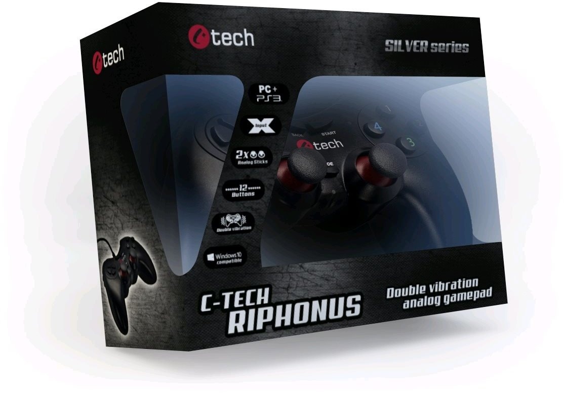 Gamepad C-TECH RIPHONUS vám nabídne ještě lepší herní zážitky. 11 tlačítek, dva analogové joysticky, osmisměrný ovladač a 2 vibrační motorky. Zní to jako standard? Budete velmi mile překvapeni. RIPHONUS ma speciální povrchovou úpravu a je skvěle ergonomicky tvarován tak, aby hraní s ním byla pro vás opravdu radost. Lze přepínat mezi digitálním a analogovým režimem. Díky X-input máte jistotu, že gamepad bude naprostou většinou her rozpoznán a nebude jej třeba nastavovat ani kalibrovat. Zajímavým bonusem je i podpora PS3.