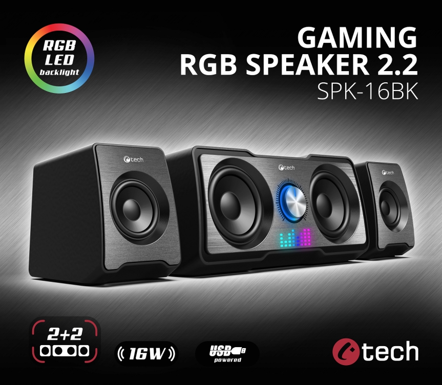 Kompaktní PC reproduktory C-tech SPK-16BK 2.2 vám zprostředkují kvalitní zvuk s výkonem 16W a frekvenčním rozsahem 150-20kHz. Díky unikátní kombinaci měničů 2+2 je reprodukovaný zvuk bohatší a více dynamický, takže si jej využijete nejen při poslechu oblíbených skladem, ale i při hraní her. O jedinečnou atmosféru při poslechu hudby se postará automatické RGB podsvícení. K ovládání hlasitosti poslouží regulátor nacházející se na jednom z reproduktorů. Tento regulátor slouží k zapnutí a vypnutí zařízení. Připojení soustavy k zařízením zajistí kabel s 3,5mm jackem, napájení zase USB kabel.