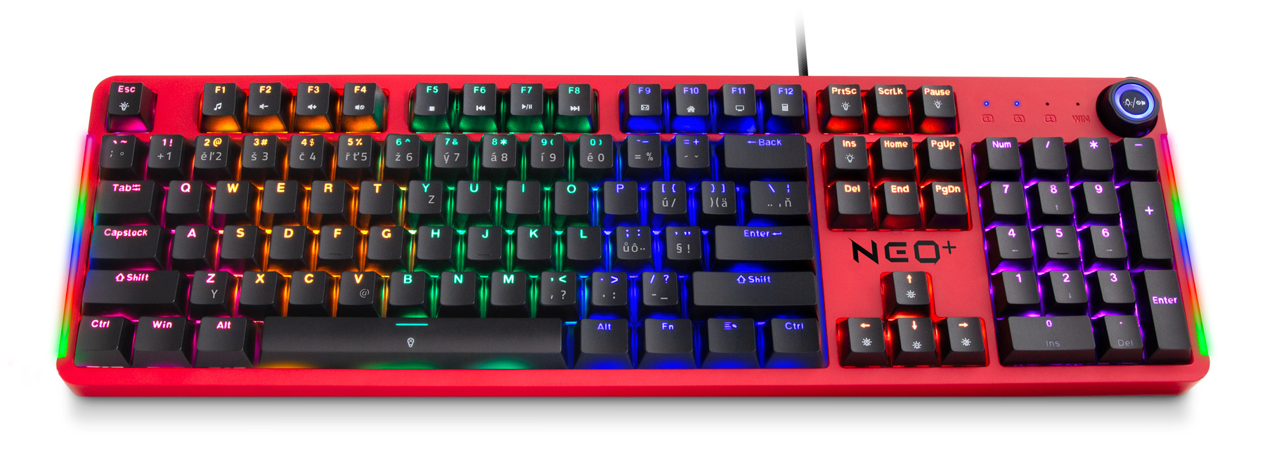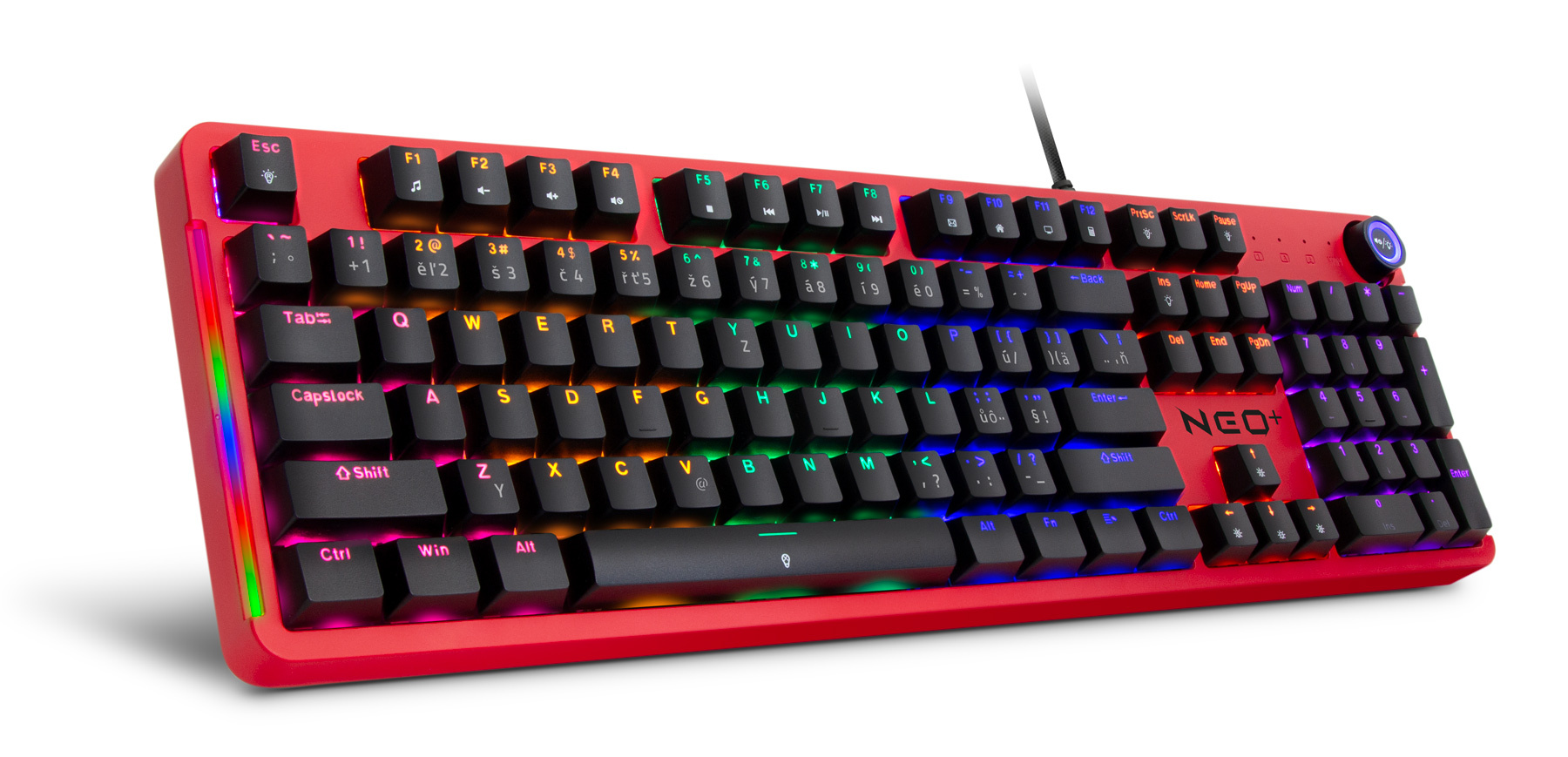 Profesionální mechanická klávesnice NEO2 + series pro hráče počítačových her v českém a slovenském layoutu s devíti módy barevného Rainbow podsvícení. K dispozici je 12 multimediálních kláves a otočné kolečko pro nastavení hlasitosti a dalších funkcí.