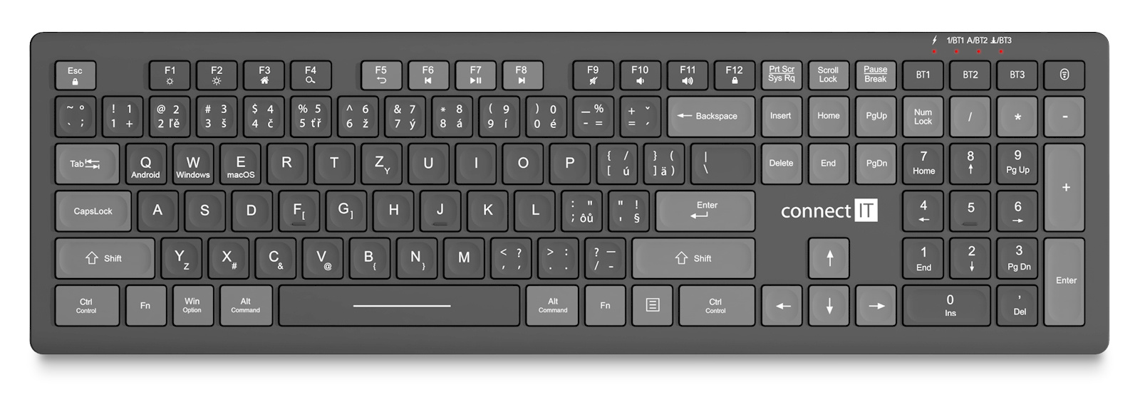 Klávesnice kromě klasických funkcí disponuje zabudovanou 350 mAh baterií s výdrží až 100 hodin a 13 multimediálními klávesami, které se obzvláště hodí do kancelářského prostředí. Unikátní technologie Quatro SmartSwitch umožňuje používat klávesnice až na čtyřech zařízeních, které podporují BT 5.0 nebo disponují USB-A vstupem. Tato funkce je ideální pro profesionální i domácí použití všude tam, kde je potřeba pracovat s jednou klávesnicí střídavě na více počítačích nebo noteboocích. Příjemný náklon klávesnice pomáhá proti únavě zápěstí během dlouhých pracovních relacích. Samozřejmostí je integrovaný úložný prostor pro USB Nano přijímač.