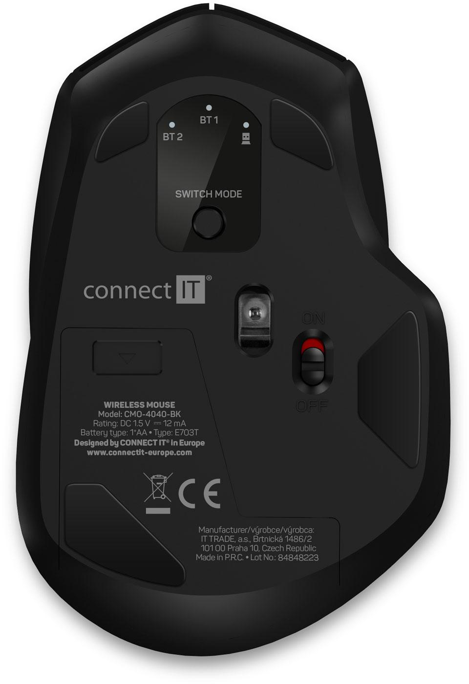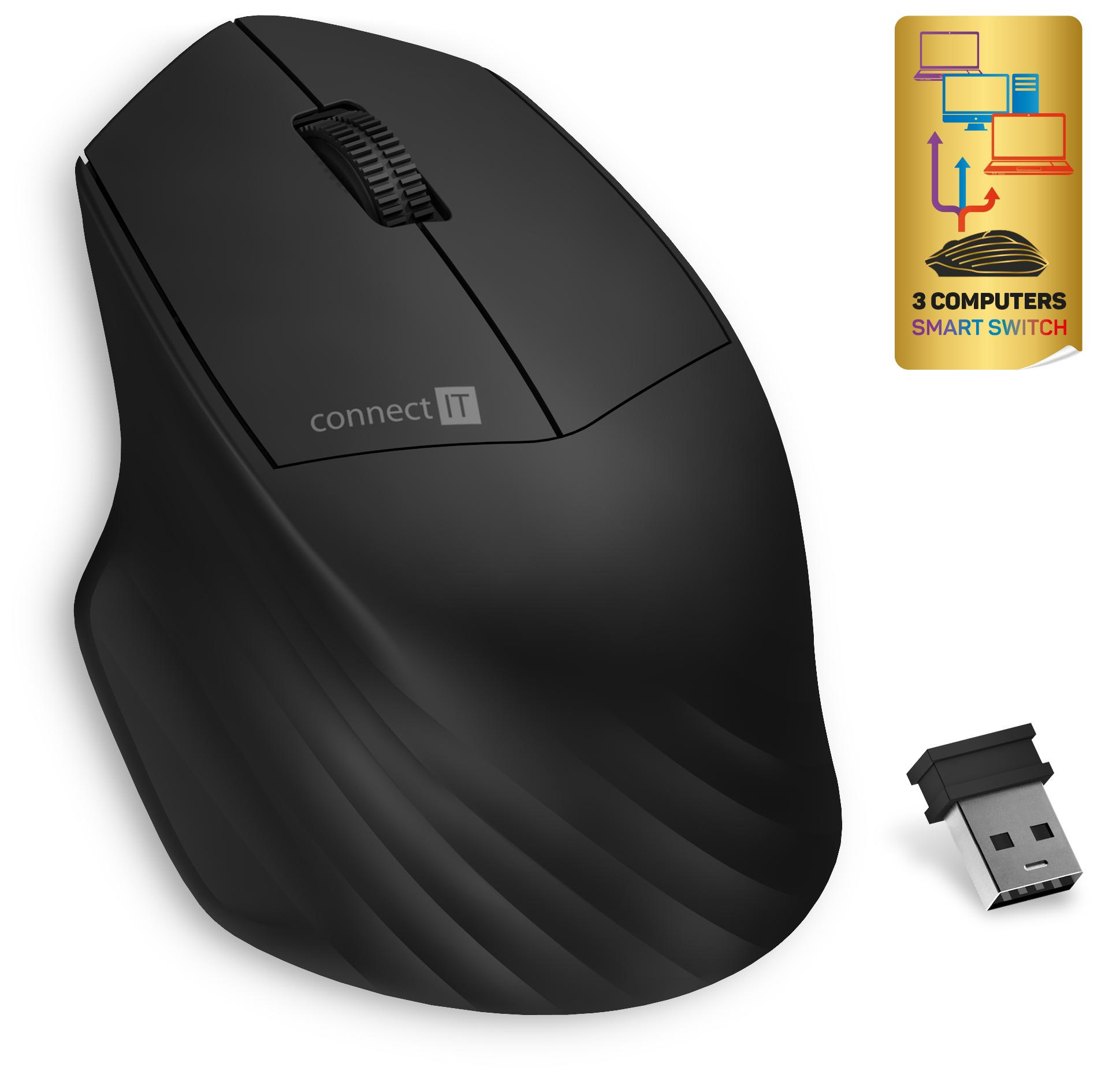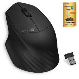 Unikátní technologie Triple SmartSwitch umožňuje používat myš až na třech zařízeních, které podporují BT 5.0, 3.0 nebo disponují USB-A vstupem. Tato funkce je ideální pro profesionální i domácí použití všude tam, kde je potřeba pracovat s jednou myší střídavě na více počítačích nebo noteboocích. Levé a pravé tlačítko myši vybavené technologií SilentClick s tichým chodem, který při klikání nevydává žádný zvuk. Samozřejmostí je integrovaný úložný prostor pro USB Nano přijímač pod krytkou bateriového prostoru. Součástí balení je originální alkalická tužková baterie CONNECT IT.