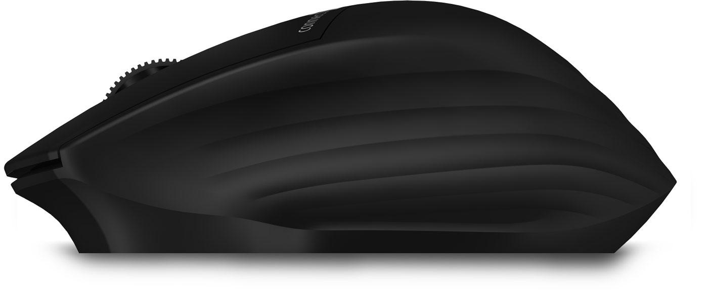 Kancelářská tichá bezdrátová myš se třemi bezdrátovými profily podporujícími standardy BT 5.0, 3.0 a Wirelless 2,4 GHz vybavená 2 tichými tlačítky MuteButton, posuvným kolečkem a tlačítkem pro přepínání bezdrátového módu.