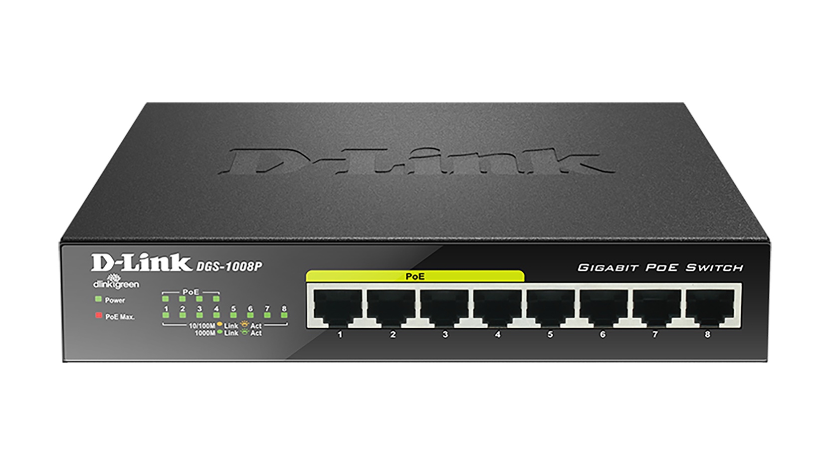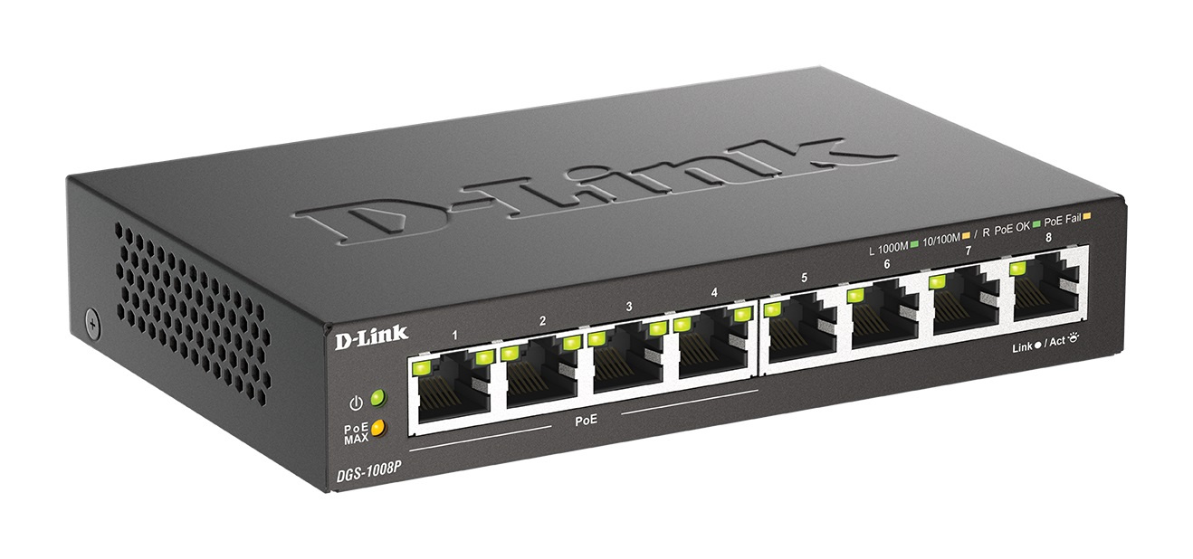 DGS-1008P obsahuje 4 porty 10/100/1000BASE-T, které podporují protokol IEEE 802.3at PoE. Každý ze 4 portů PoE může dodávat až 30 wattů s celkovým rozpočtem PoE 68 wattů, což uživatelům umožňuje připojit zařízení kompatibilní s IEEE 802.3at k DGS-1008P bez nutnosti dalšího napájení. PoE je vhodné zejména pro zařízení, která jsou daleko od elektrických zásuvek nebo když chcete minimalizovat změť kabelů navíc. Pokud zařízení není kompatibilní s PoE, může adaptér D-Link DWL-P50 PoE přeměnit jakýkoli běžný ethernetový port na ethernetový port PoE.