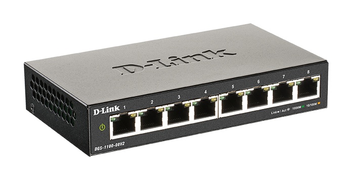 D-Link DGS-1100-08V2 je 8-portový Gigabit Smart řízený přepínač v kompaktním kovovém provedení bez ventilátorů, pro položení na stůl, na poličku nebo montáž na zeď. Nabízí základní sadu L2 funkcí (např. VLAN, QoS, IGMP Snooping, agregace linek) s možností správy z webového rozhraní, pomocí SNMP příkazů nebo nástroje D-Link Network Assistant (DNA). Switch je určený především pro kanceláře (SOHO) a malé a střední podniky (SMB).