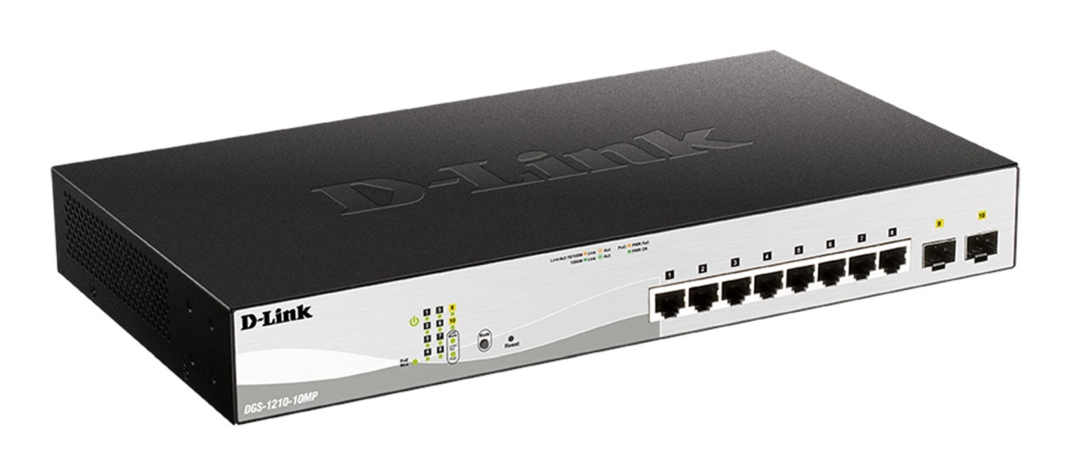 D-Link DGS-1210-10MP je 10-portový PoE+ Gigabit Ehernet L2/L3 Smart Managed switch bez větráků, vhodný pro podnikové sítě (SMB) a kamerové systémy. Je osazený 8 porty 10/100/1000M RJ-45 s podporou napájení 802.3af/802.3at PoE+ (max. 30W) a dvěma 100/1000M SFP sloty s podporou 100M SFP a Gigabit SFP transceiverů. Celkový PoE výkon přepínače je 130W. Napájení přepínače je 230V AC, součástí dodávky jsou držáky pro montáž do 19“ rozvaděče.