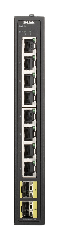 D-Link DIS-100G-10S je průmyslový 10-portový Gigabit Ethernet switch bez managementu, osazený 8 porty 10/100/1000M RJ-45 a dvěma Gigabit SFP sloty pro optický uplink. Přepínač je určen pro montáž na DIN lištu. Je v robustním kovovém provedení bez ventilátoru, se stupněm krytí IP40 a s rozšířeným rozsahem provozních teplot -20°C až +65°C. Pro napájení s možností redundance jsou k dispozici dvě svorkovnice 12V-48V DC, volitelně lze dokoupit 230V AC zdroj (např. D-Link DIS-H30-24). Switch je vhodný pro instalaci do klimaticky náročných prostředí, jako jsou průmyslové aplikace, automatizace, dopravní aplikace, kamerové systémy, internet věcí (Internet of Things, IoT), chytrá města (Smart Cities) apod.