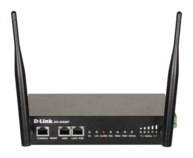 Průmyslový AC1200 Wave 2 Wi-Fi přístupový bod D-Link DIS-2650AP je navržen speciálně pro provoz v náročných prostředích s širokým rozsahem provozních teplot d -20°C do 65°C. Je dodáván v robustním kovovém pouzdře pro instalaci na DIN lištu nebo na zeď, s externími oddělitelnými anténami. Vestavěná 2kV přepěťová ochrana a 15kV ESD ochrana chrání přístupový bod proti přepětí a elektrostatickými výboji (ESD). Dva gigabitové LAN porty slouží pro kabelové připojení přístupového bodu k přepínači a pro připojení dalšího zařízení. DIS-2650AP lze napájet přes Power over Ethernet (802.3at PoE+) nebo přes duální svorkovnici 12V-48V DC. Externí napájecí zdroje 230V AC jsou k dispozici jako volitelné příslušenství.