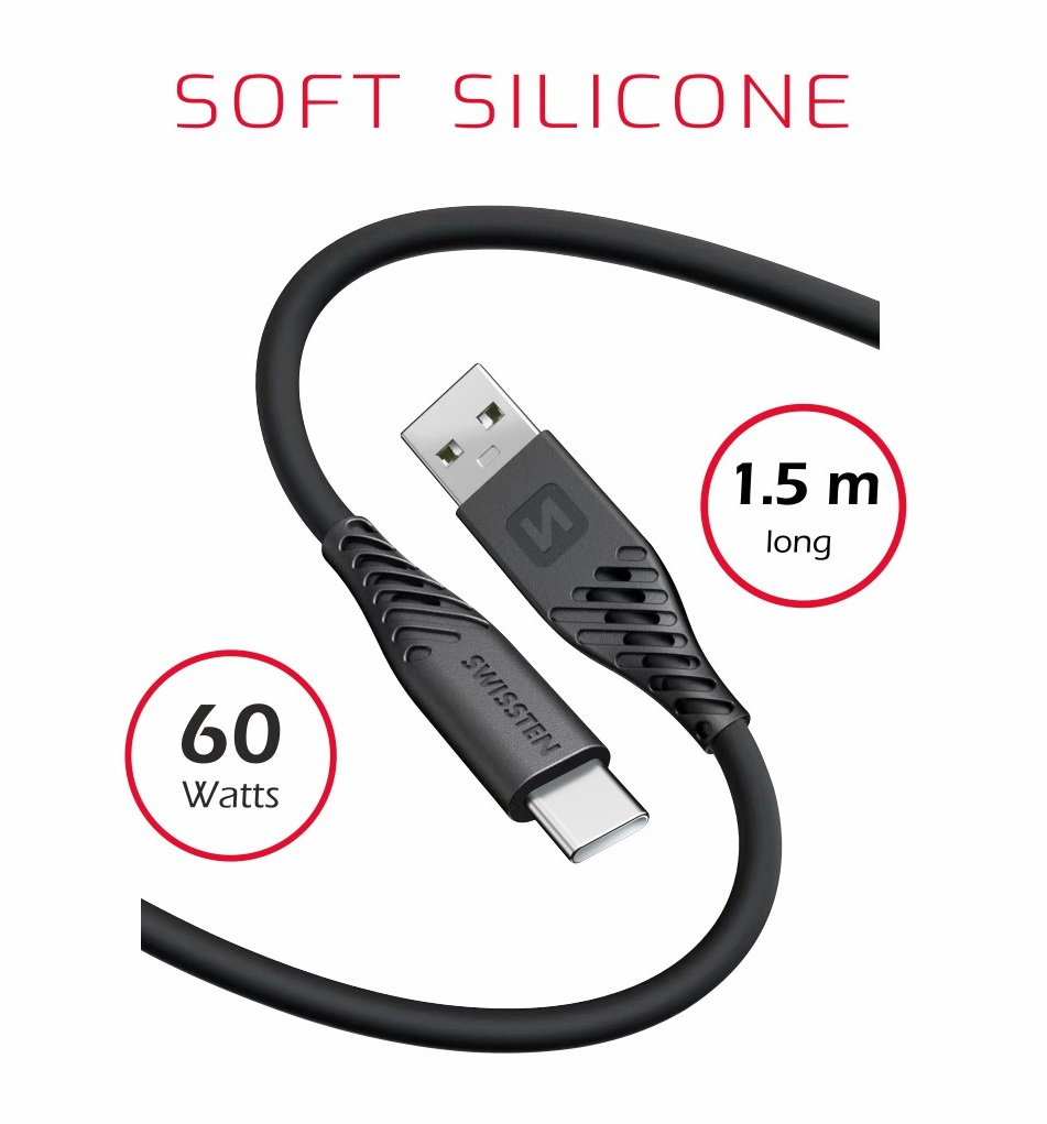 DATOVÝ KABEL SWISSTEN SOFT SILICONE USB / USB-C 1,5 M 60W ČERNÝ